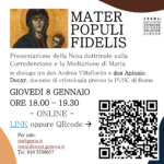 NEWS Presentazione della nota “Mater Populi Fidelis” con il prof. Ducay Nell’ambito del corso di mariologia del prof. Villafiorita, l’ultima lezione sarà un colloqui con il prof. Antonio Ducay, ordinario di cristologia presso la PUSC di Roma, sulla recente nota dottrinale “Mater Populi Fidelis” sulla corredenzione, la mediazione e la maternità universale di Maria. Giovedì 8 gennaio, dalle 18 alle 19.30… Festività natalizie e chiusura attività di segreteria Le segreterie ISSRL osserveranno i seguenti giorni ed orari di apertura: Segreteria Genova apertura al pubblico, nei seguenti giorni: Lunedì… Sede Genova: Domenica 21 Dicembre ore 20.30 “Entriamo nell’attesa del Signore: Vieni Signore Gesù” BONUS PRESENZA Domenica 21 p.v alle ore 20.30, si svolgerà il secondo incontro del Ciclo di conferenze ” Nel cuore… ARCHIVIO NEWSBACHECA Lezioni settimana dal 7-8: assenze Docenti e cambi orari Avviso aggiornato 07/01/2026 Primo anno Mercoledì 7, Regolari le lezioni di Storia della Chiesa I (prof. Gorini) , Filosofia dell’Essere… Presentazione della nota “Mater Populi Fidelis” con il prof. Ducay Nell’ambito del corso di mariologia del prof. Villafiorita, l’ultima lezione sarà un colloqui con il prof. Antonio Ducay, ordinario di… Sessione d’esame invernale: modifiche e aggiornamenti Avviso aggiornato al 30/12/25 Inserita data di apppello Prof Corini Modifica date di appello Prof Damonte Modifica data di appello… Il Concilio Vaticano II. A 60 anni dalla sua chiusura Mercoledì 17 dicembre 2025 alle ore 17.00 in presenza presso la Sede Genova di ISSRLigure (Via Serra 6c) ed in collegamento… ARCHIVIO AVVISIACCESSO STUDENTE/DOCENTE Password dimenticata? studente / docente ATTIVITÀ dei DOCENTI Sede Genova: Venerdì 12 dicembre ore 17.00 In ricordo del prof Carlo Lupi BONUS PRESENZA STUDENTI ISSRL Si rinnova la presentazione del volume “I Fondamenti della politica secondo Tommaso d’Aquino”, con la nuova… Sede FAD La Spezia: Incontro sul tema “A quelle parole, ella rimase turbata (Lc 1, 29)” A quelle parole, ella rimase turbata: una preparazione al Natale nella vigilia dell’Immacolata Domenica 7 dicembre, alle ore 19:00, presso… Sede Genova: Mercoledì 3 Dicembre Incontro con P. Eugenio Cavallari Nell’ambito dei corsi di Storia della Filosofia e Filosofia dell’essere e del pensiero (Porf Zoppi), in occasione della lezione di… Sede Genova: Martedì 21 ore 14.40 Presentazione “Introduzione alla Ecclesiologia” del Prof G. Militello Martedì 21 Ottobre, in sede Genova, durante l’orario di lezione (a partire dalle ore 14.40), sarà presentato il volume “Introduzione… ARCHIVIO Immatricolazioni FOTOGALLERY Conclusa la III Giornata di Studi ITA – ISSRL: Martedì 8 aprile “Il cuore di Dio per il cuore dell’uomo” Inaugurazione A. A. 2024/2025: San Bonaventura da Bagnoregio e San Tommaso D’Aquino. Quale attualità? II Giornata di Studi ISSRL- ITA: al centro l’Ecologia Cristiana I Giornata di Studi FTIS, sezione Genova e ISSRL: “Comunione, partecipazione e corresponsabilità” LINK ISTITUZIONALI