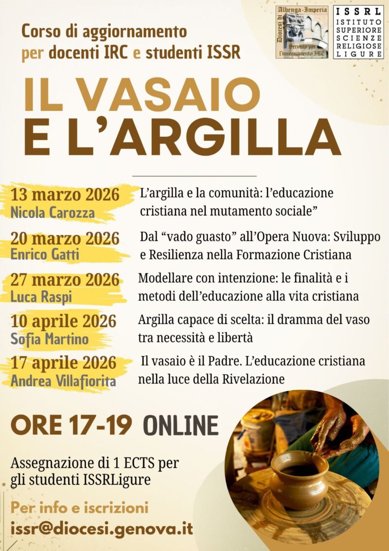 Prima edizione del Corso “Il Vasaio e l’argilla”, nato dalla collaborazione fra l’Ufficio Scuola Diocesano Albenga-Imperia e ISSRLigure, che propone un percorso di aggiornamento alla formazione didattica per gli operatori IRC.