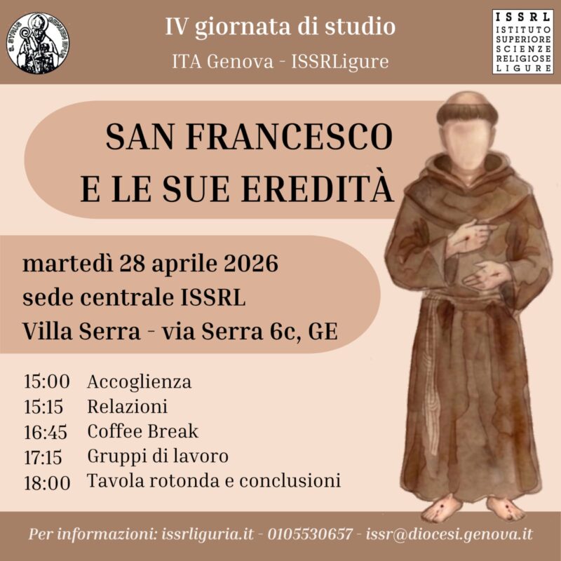 Martedì 28 aprile 2026, in sostituzione della data proposta da calendario accademico 21 aprile, presso Villa Serra, si terrà la IV Giornata di Studio ITA-ISSRL “San Francesco e le sue eredità”. L’iniziativa intende offrire uno spazio di riflessione condivisa sulla figura di san Francesco d’Assisi, mettendone in luce la ricchezza spirituale, il pensiero e l’influenza esercitata nel corso dei secoli fino alla contemporaneità.