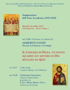 Martedì 14 ottobre 2025 alle ore 15.00 si terrà l’Inaugurazione dell’Anno Accademico 2025/2026 della Facoltà dell’Italia Settentrionale – Istituto Teologico Affiliato di Genova (ITA) e dell’Istituto Superiore di Scienze Religiose Ligure (ISSRL), presso la Sala Quadrivium in Genova.